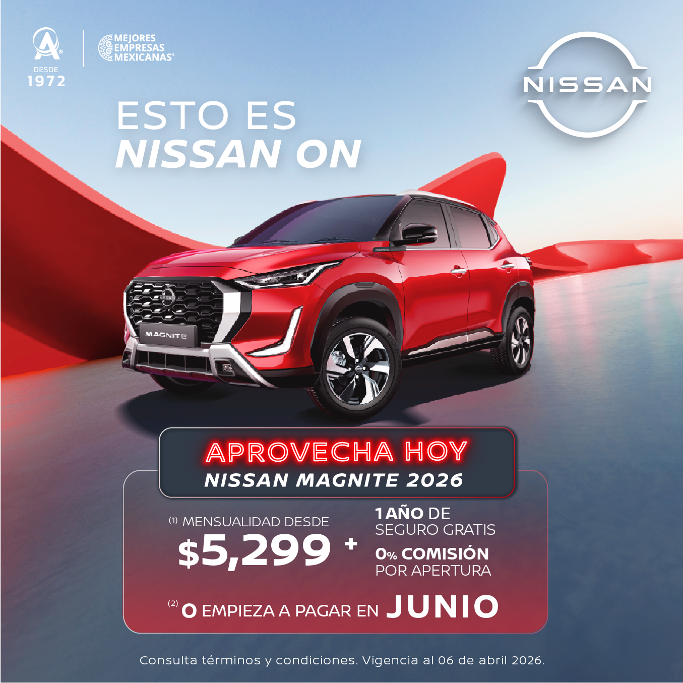 Se aplica para MAGNITE ADVANCE CVT 26 en plan tradicional CrediNissan con el 35% de enganche a 72 meses, 1 año de seguro gratis y 0% comisión por apertura. Tasa anual de 9.89% y CAT promedio sin IVA de 11.3%. (2) Aplica para todas las versiones Magnite 2026 en operaciones de crédito celebradas con CrediNissan. No aplica con otras promociones ni en compra de flotillas. Para conocer planes y modalidades de crédito, verificar precios, requisitos de contratación, comisiones, disponibilidad, términos y condiciones, consulta a tu Distribuidor Autorizado Nissan. Vigencia del 06 de abril de 2026.