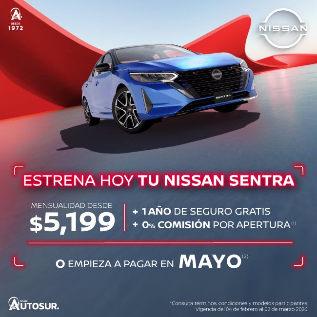 Se aplica para SENTRA SENSE TM 25 en plan tradicional Credi Nissan con el 40% de enganche a 72 meses, 1 año de seguro gratis y 0% comisión por apertura. Tasa anual de 9.40% y CAT promedio sin IVA de 10.6%. (2) Aplica para todas las versiones Sentra 2025 en operaciones de crédito celebradas con Credi Nissan. No aplica con otras promociones ni en compra de flotillas. Para conocer planes y modalidades de crédito, verificar precios, requisitos de contratación, comisiones, disponibilidad, términos y condiciones, consulta a tu Distribuidor Autorizado Nissan. Vigencia del 04 de febrero al 02 de marzo 2026.